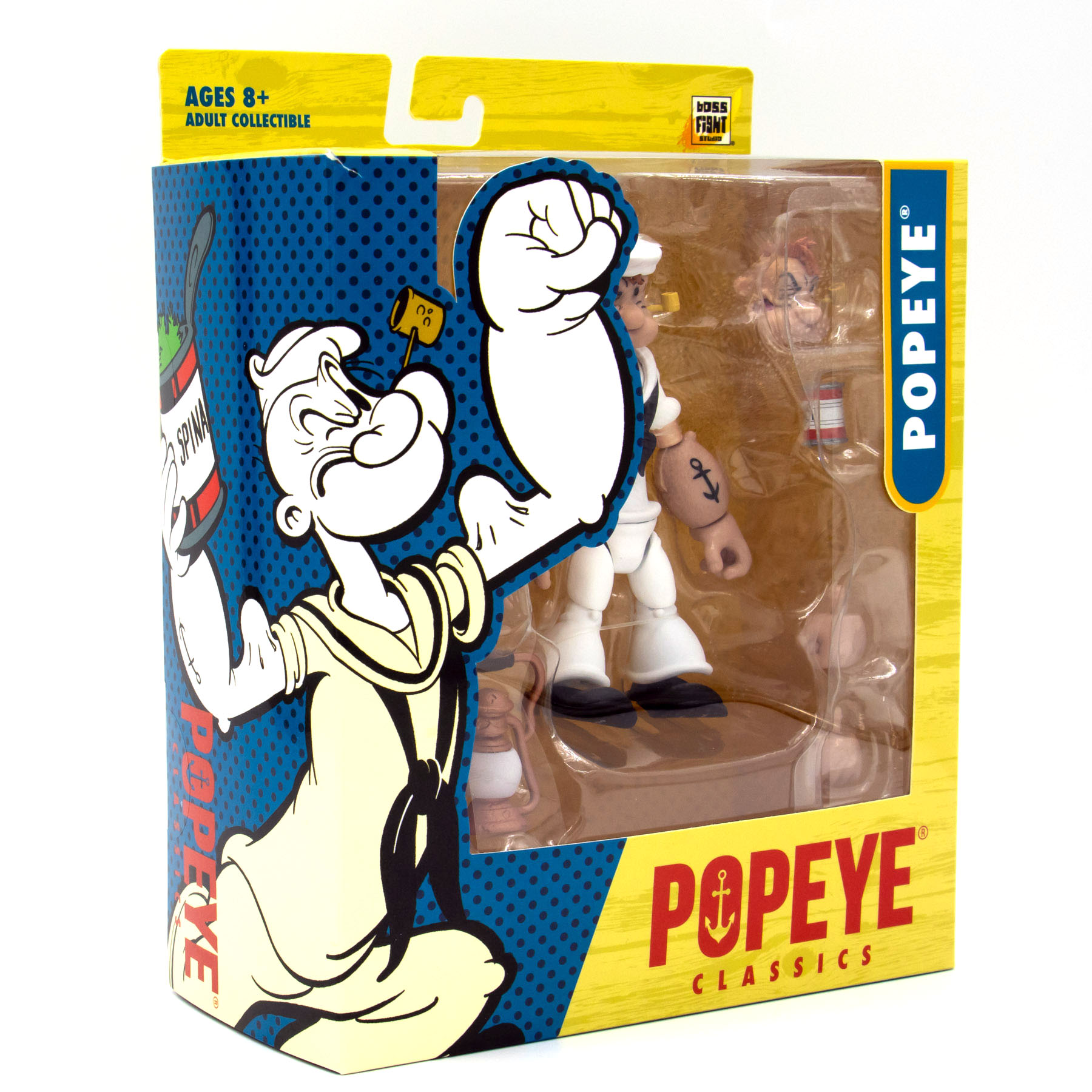 Zur Ausstattung gehören ein austauschbarer Kopf, zwei austauschbare Fäuste, eine Öllampe, eine Matrosenmütze und natürlich die unverzichtbare Spinat-Dose. Mit der flexiblen Gestaltung dieser Popeye Actionfigur lassen sich unzählige Szenen nachstellen – allein oder gemeinsam mit Olivia und Brutus.