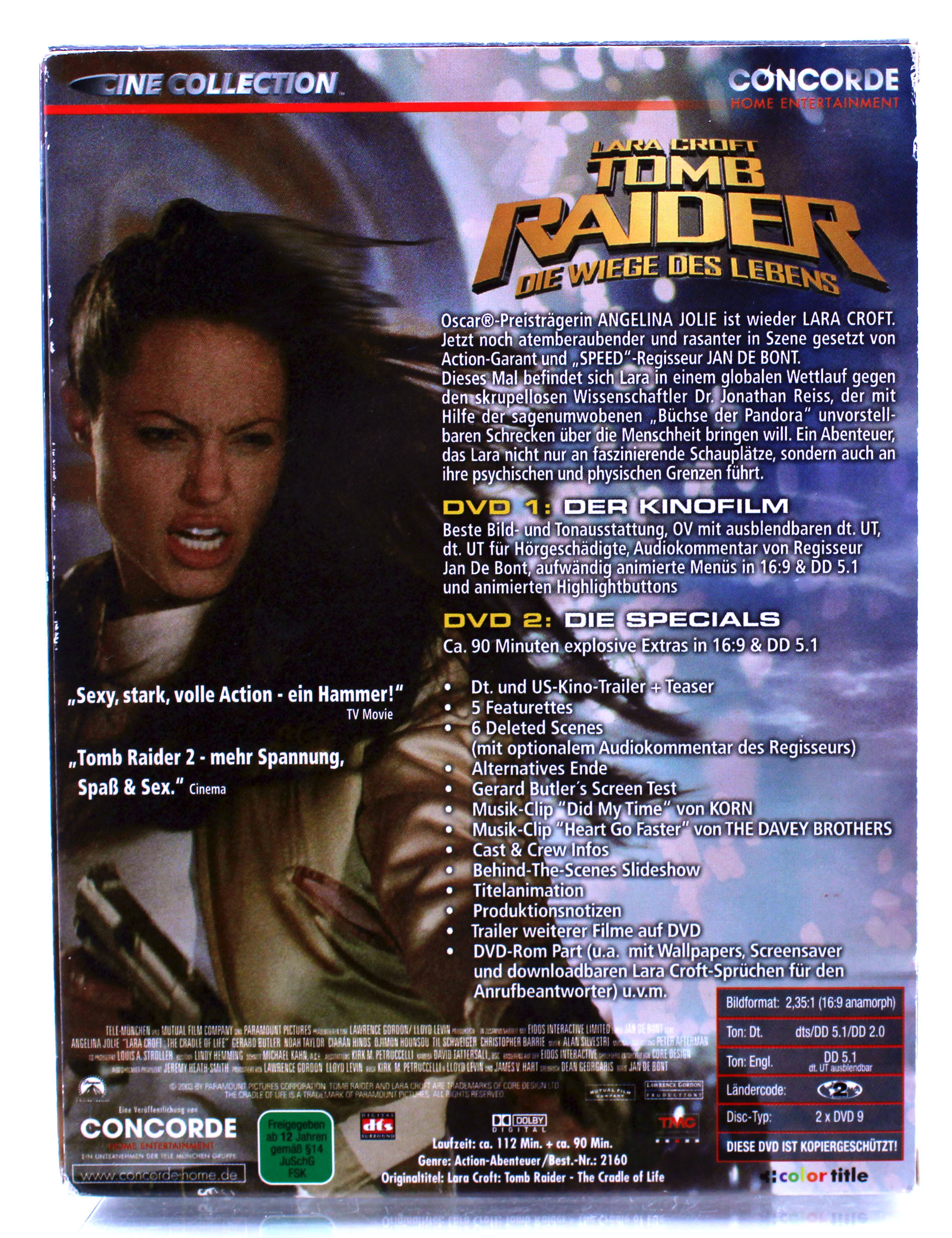 Aufwendig animierte Menüs; Audiokommentar von Regisseur Jan De Bont; Kinotrailer von Tomb Raider Teil 1+2; Dt. und US-Kinotrailer und -Teaser; 5 Featurettes (Training, Vehicles and Weapons, Stunts, Visual Effects, Scoring); 6 Deleted Scenes; Alternatives Ende; Musik-Clip von "Korn"; Musik-Clip von "The Davey Brothers"; Screentest mit Gerard Butler; Behind-The-Scenes Slideshow; Cast & Crew Infos; Produktionsnotizen; Titelanimation; Trailer weiterer Filme auf DVD;