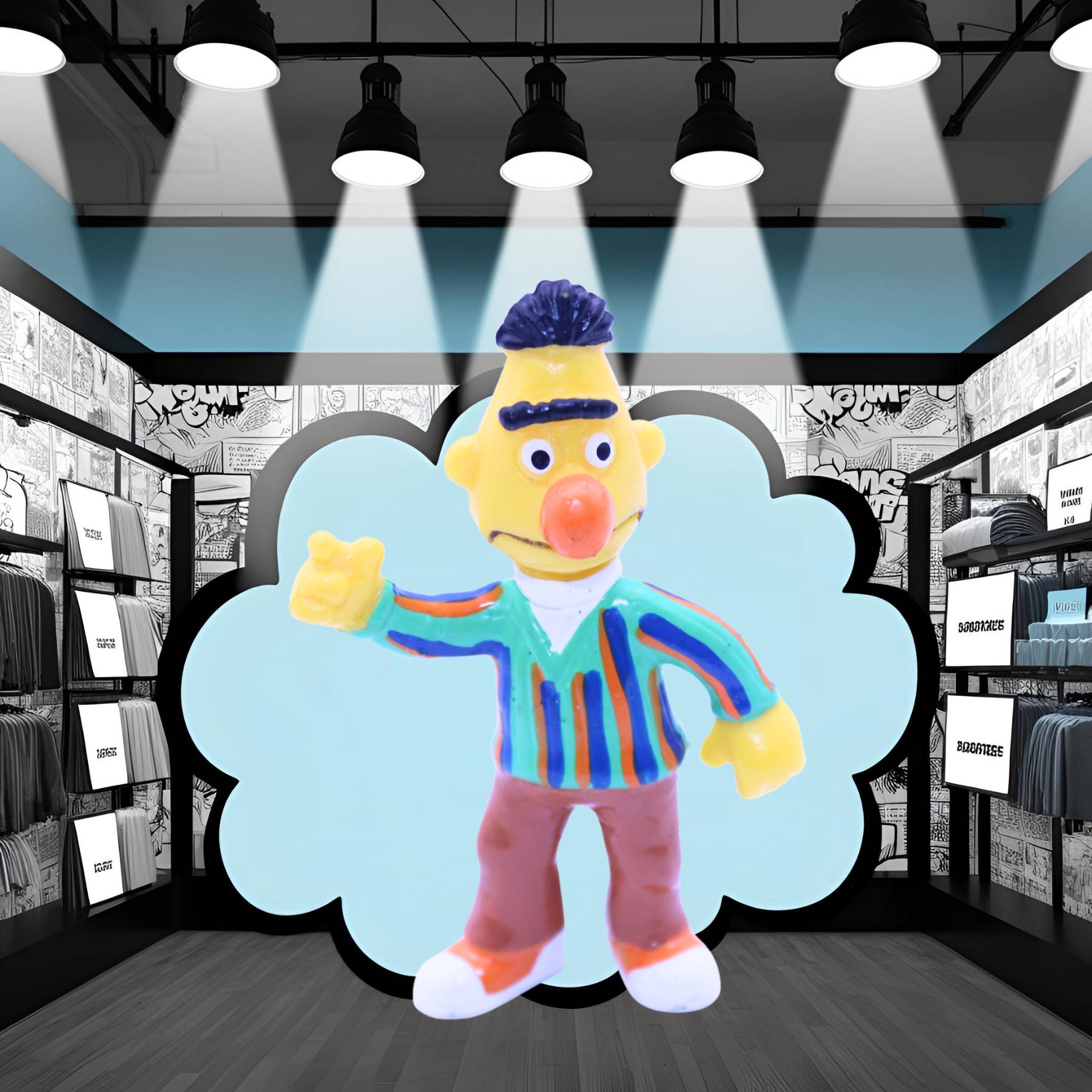 Ein bunt gestreifter Langarm-Pullover, hellbraune Hose, sowie die klassischen orange-weißen Turnschuhe lassen keine Zweifel an seiner ikonischen Erscheinung. Die Figur wirkt besonders lebendig – sein rechter Arm ist gehoben, als wolle er gleich die Finger schnippen, während sein Gesichtsausdruck freundlich-nachdenklich daherkommt – ganz der Bert, wie wir ihn kennen!